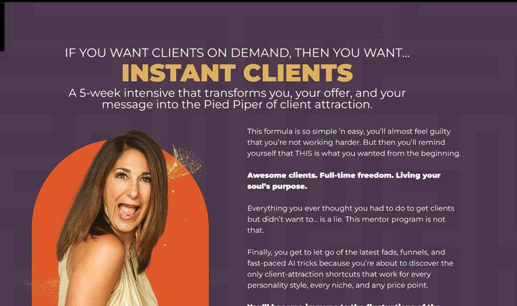 THE SIMPLE, NO-FAIL FORMULATHAT ATTRACTS IDEAL CLIENTSat any price point, in any niche, and in any economy… EVEN IF YOU THINK YOU SUCK AT SELLING.JOIN NOWAS FEATURED IN:Check-in time. Do you ever feel… Resistance to doing the stuff you need to do in order to get more clients? Let down because you learned and implemented a new marketing strategy and it didn’t create a frenzy of buyers… yet again? A driving need to truly live your mission so you can serve more clients (and make more money)… but you’re clueless as to what it’s gonna take to finally get to 6 or 7 figures this year?I feel ya! Most of us get into business to do something truly fulfilling so we can have more time and financial freedom. It totally sucks to spend so much time marketing yet never really move the needle to achieve success you’re proud of.You know you bring value to the table, but why the hell don’t potential clients and customers jump on your products, programs, and services like white on rice?!Not knowing how to have a constant flow of clients causes a constant slew of issues that can weigh heavily on your soul like… Battling to find an ideal way to be more visible, gain more followers, and have a fan base to consistently market to. Doubting your value and price points because potential clients seem to be interested but don’t take the final step to commit. Fumbling to find the perfect words that describe what you offer so you get an instant “Yes!” every time. Putting huge amounts of pressure on yourself to do “something” (anything! )that’ll bring in more income right now… making you feel desperate and icky. Feeling confused and overwhelmed by all this online marketing and AI shizz you have to learn and implement. Ugh!Attracting clients can feel like a full-time job. And the emotions that’re triggered when you don’t succeed negatively impact your mood, bank account, and lifestyle.And you shouldn’t tolerate this for one more day!Instant Clientsto ensure you easily get new clients whenever you want ’em… Join The 5-WeekMentor ProgramJOIN NOWThere is another way… a simpler way that guarantees more clients in a fraction of the time… and eliminates all stress related to “getting sales.”Imagine having a framework that…Turns you into a superhero in your niche, attracting new followers every day… without having to leave your comfort zone or natural zone of genius.Allows you to easily get new customers without ever having to sell or to do anything weird or complicated.Doubles the results of any client-attraction strategies you already have in place… and lets you ditch all the time-sucking strategies that make you cringe.This isn’t a pie-in-the-sky, sappy, made-up fairy tale. This is reality that’s 100% possible whether you’re new to your niche or you’ve had a flatlined business for decades.It’s possible because it shows you how to strip away all outdated premises of marketing, stay true to who you are, and learn a new approach that simplifies the entire process.This exciting framework makes 5-Star Clients say yes without endless follow-up, costly marketing, or having to pray for a miracle.If you want clients on demand, then you want…Instant ClientsA 5-week intensive that transforms you, your offer, and your message into the Pied Piper of client attraction.This formula is so simple ’n easy, you’ll almost feel guilty that you’re not working harder. But then you’ll remind yourself that THIS is what you wanted from the beginning.Awesome clients. Full-time freedom. Living your soul’s purpose.Everything you ever thought you had to do to get clients but didn’t want to… is a lie. This mentor program is not that.Finally, you get to let go of the latest fads, funnels, and fast-paced AI tricks because you’re about to discover the only client-attraction shortcuts that work for every personality style, every niche, and any price point.You’ll become immune to the fluctuations of the economy… which means you’re fully in charge of your destiny.And never again will you have to make a marketing move that feels complicated, slick, or stressful. Never.Because this formula makes you magnetic to your perfect clients, without having to be perfect!Instant Clientsto ensure you easily get new clients whenever you want ’em… Join The 5-WeekMentor ProgramJOIN NOWHere’s what you’ll uncover during this 5-week intensive…Week #1: Instant Yes PhenomenonBecome a person and brand that’s naturally irresistible… making it impossible for your ideal clients to say no.Discover how to… Use your 5-star filter to create a vacuum of focus on the offers and clients that’ll simplify your business and make you a lot more money… in half the time. Build a customized client-attraction “story stack” that slays your sabotaging self-talk… allowing you to emerge as a superstar in your niche. Activate your Inner Money Maker to guarantee your income flow increases far beyond what you need… and moves you into “pinch me” status.Week #2: Supernatural MessagingThe art of communication that creates certainty within potential clients so they’re excited to follow you… and buy.Discover how to… Stop overthinking and channel the exact words that’ll pique your ideal clients’ interest so they want to know more about what you offer… right now. Fully become and embody your message. Spotlight your natural personality and style to attract clients that get you, trust you, and want to buy… no matter the price point. Share and educate in concise and clear language that positions you as a standout expert or brand (even in overcrowded niches) without sounding cheesy, hypey, or lame.Week #3: Superpowered MarketingTurn your products, programs, and services into best sellers without ever leaving your comfort zone.Discover how to… Uncover your marketing superpower to generate a record number of followers and super fans for future sales. Snap a simple strategy in place