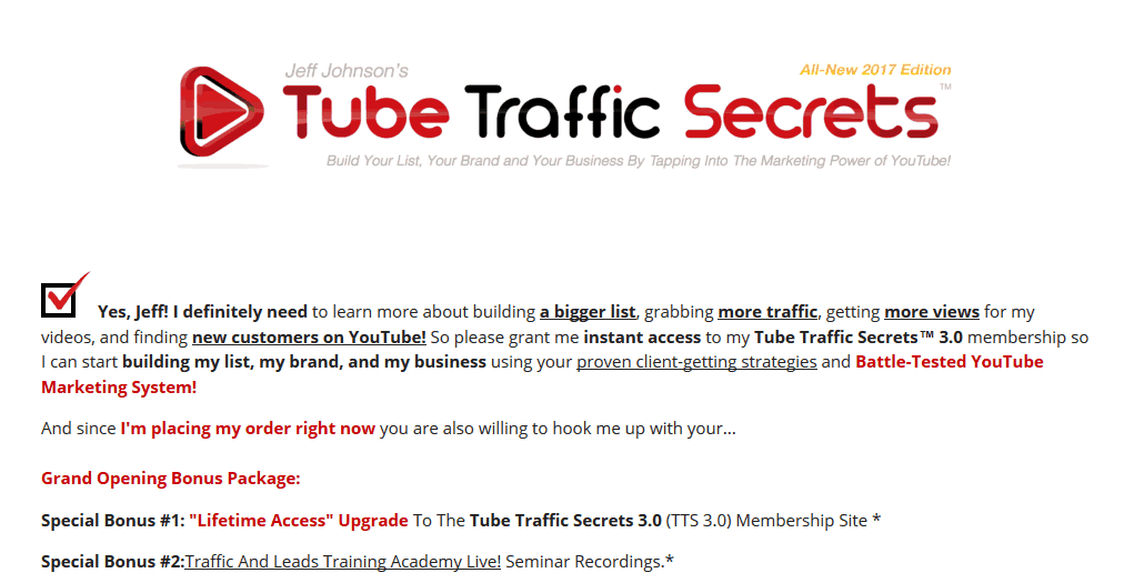 es, Jeff! I definitely need to learn more about building a bigger list, grabbing more traffic, getting more views for my videos, and finding new customers on YouTube! So please grant me instant access to my Tube Traffic Secrets™ 3.0 membership so I can start building my list, my brand, and my business using your proven client-getting strategies and Battle-Tested YouTube Marketing System!